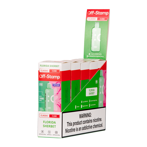 - Flavor: The Florida Sherbet Off Stamp flavor blends a tasty citrus with a creamy sherbet taste. The disposable Florida Sherbet Off Stamp Cube is serves as a refill for and attaches to the reusable Off Stamp X-Cube charging device which is sold separately in the Off Stamp X-Cube Kit.