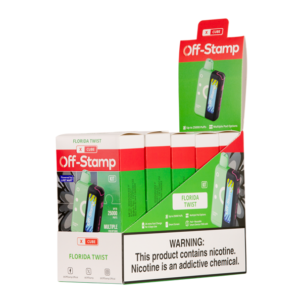 - Flavor: The Florida Twist Off Stamp X-Cube kit features a rainbow sherbet flavored disposable pod that attaches to the reusable battery charging device, which is included.
