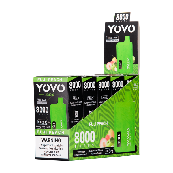 - Flavor: The Fuji Peach YOVO JB8000 vape blends equal parts of crisp Fuji Apple and ripe Georgia Peach. Each YOVO Bar provides a long-lasting vape experience.