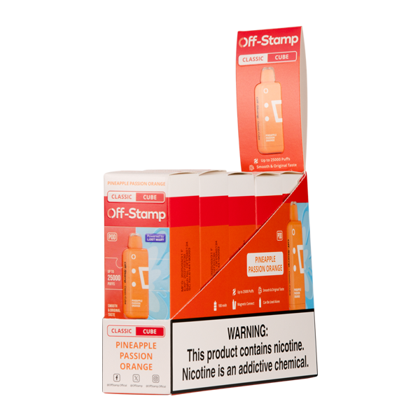 - Flavor: The Pineapple Passion Orange Off Stamp flavor mixes tropical fruit flavors for a delightful vaping experience. The disposable Pineapple Passion Orange Off Stamp Cube is serves as a refill for and attaches to the reusable Off Stamp X-Cube charging device which is sold separately in the Off Stamp X-Cube Kit.