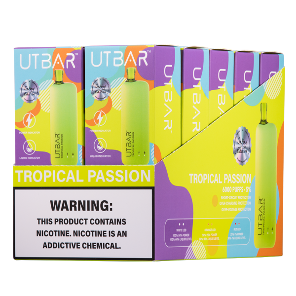 - Flavor: The Tropical Passion UT Bar disposable vape features a delectable blend of kiwi and passionfruit flavors, providing a refreshing and mentholated finish. Made with Flum technology, this vape is designed to deliver a satisfying experience with its rich fruit flavors.