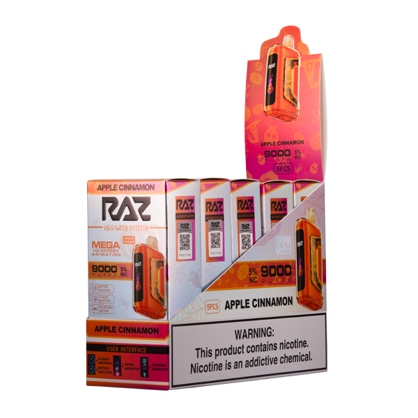 - Flavor: Get ready for an unforgettable adventure with Raz TN9000 Apple Cinnamon Halloween Edition, available now at Vaping.com! Every puff takes you on a flavorful trip with the perfect balance of crisp apples and comforting cinnamon. Experience this unique and delicious blend for yourself.