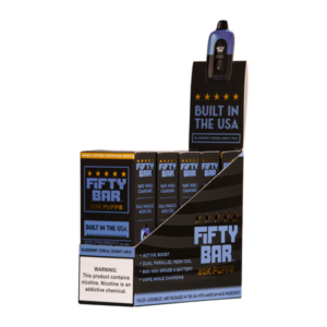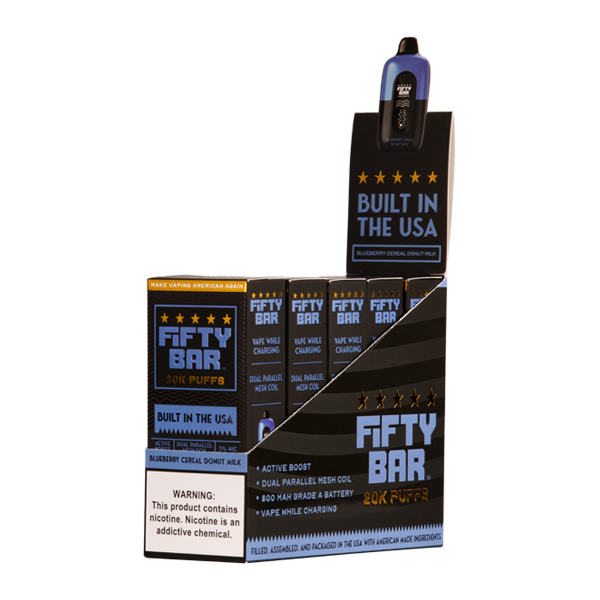 - Flavor:Inspired by the legendary The One Blueberry, this US-made Fifty Bar 20K features a blend of creamy flavor with tart blueberry notes and a hint of sugar coated cereal. The Fifty Bar 20K is a high-performance Smart Vape with anti-burn technology, adjustable airflow and always active boost mode.