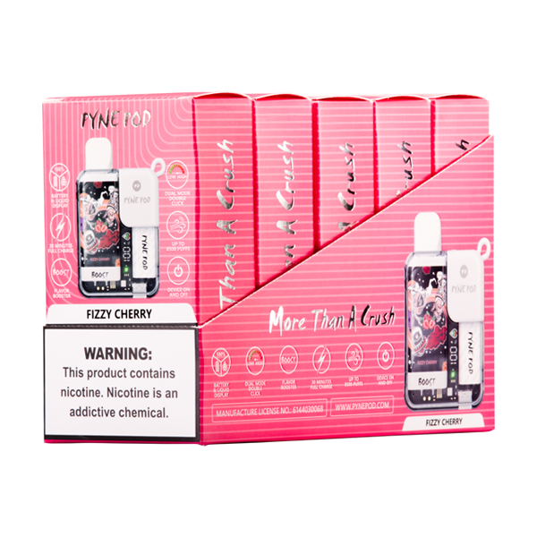 - Flavor: Every puff of the Fizzy Cherry Pyne Pod feels like an exciting, bubbly adventure. Its pop of cherry flavors with a fizzy twist adds a sparkle to your vaping experience. Tart and sweet cherry notes are perfectly balanced with coolness and effervescence.