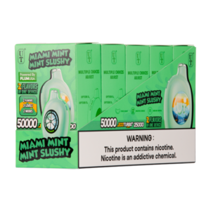 - Flavor: Available at Vaping.com, the dual flavor UT 50K features Miami Mint and Mint Slushy flavors.These flavors can be blended at various levels to create a unique and customizable vaping experience. There is also an Eco Mode that can extract up to 50,000 puffs and a powerful boosted mode that slashes puff count but increases vapor production. All of this can be controlled with a pair of buttons and monitored on the colorful full size screen.