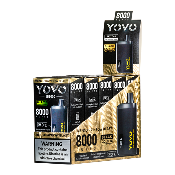 - Flavor: Available at Vaping.com, dive into the effervescent flavors Rainbow Mento Blast Yovo JB8000 Black Golden Edition, where a spectrum of confection flavors meets a curiously strong and frosty mint finish.